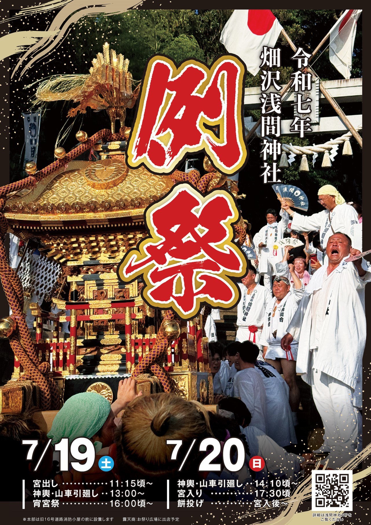 勢揃い 子供神輿・山車の参加者 13時50分 於:畑沢区集会場集合 本社神輿の参加者 13時50分 於:白旗神社前集合 本社神輿担ぎ出し 14時 畑沢集会場発(本社神輿は台車搬送) 本社・子供神輿及び山車の渡御 14時30分 畑沢集会場発(本社神輿は台車搬送) 山車日子供神興渡御 15時30分 中央鈑金前 山車日子供神興終了 16時50分 お祭り広場着 本社神輿:宮入(渡御終了) 17時30分 御霊返し 17時30分~17時40分 於:畑沢浅間神社鳥居 紅白餅・祝銭投げ及びお菓子投げ 17時40分~18時 於:お祭り広場内 【奉納者】- 小泉武 神社総代